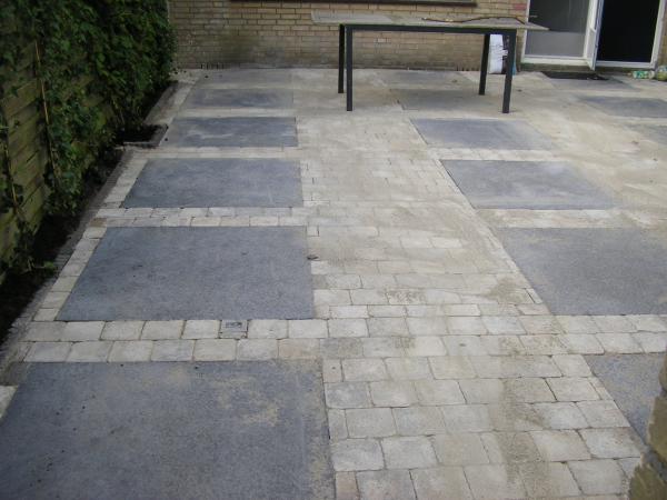 In Alblasserdam hebben wij een bestaande tuin met trommelkassei 20×20 cm uit gebroken en deze overnieuw gebruikt in combinatie met 100×100 Schellevis tegels(antraciet)